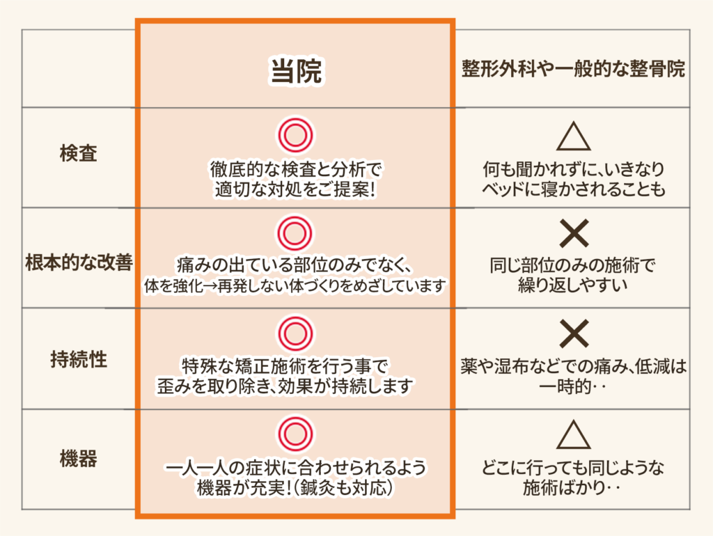 同じ「整骨院」という名称ではありますが、それぞれの院で対応可能な症状や強みにしている施術方法は異なります。